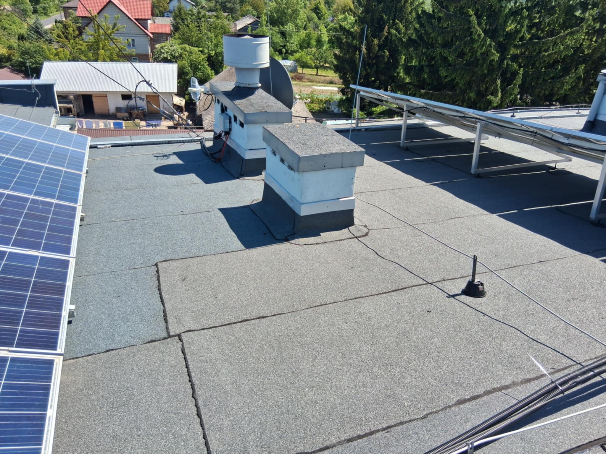 Prace obejmowały obróbki blacharskie, obróbki tynkarskie przewodów kominowych i wentylacyjnych oraz położenie 3 warstw papy termozgrzewalnej.