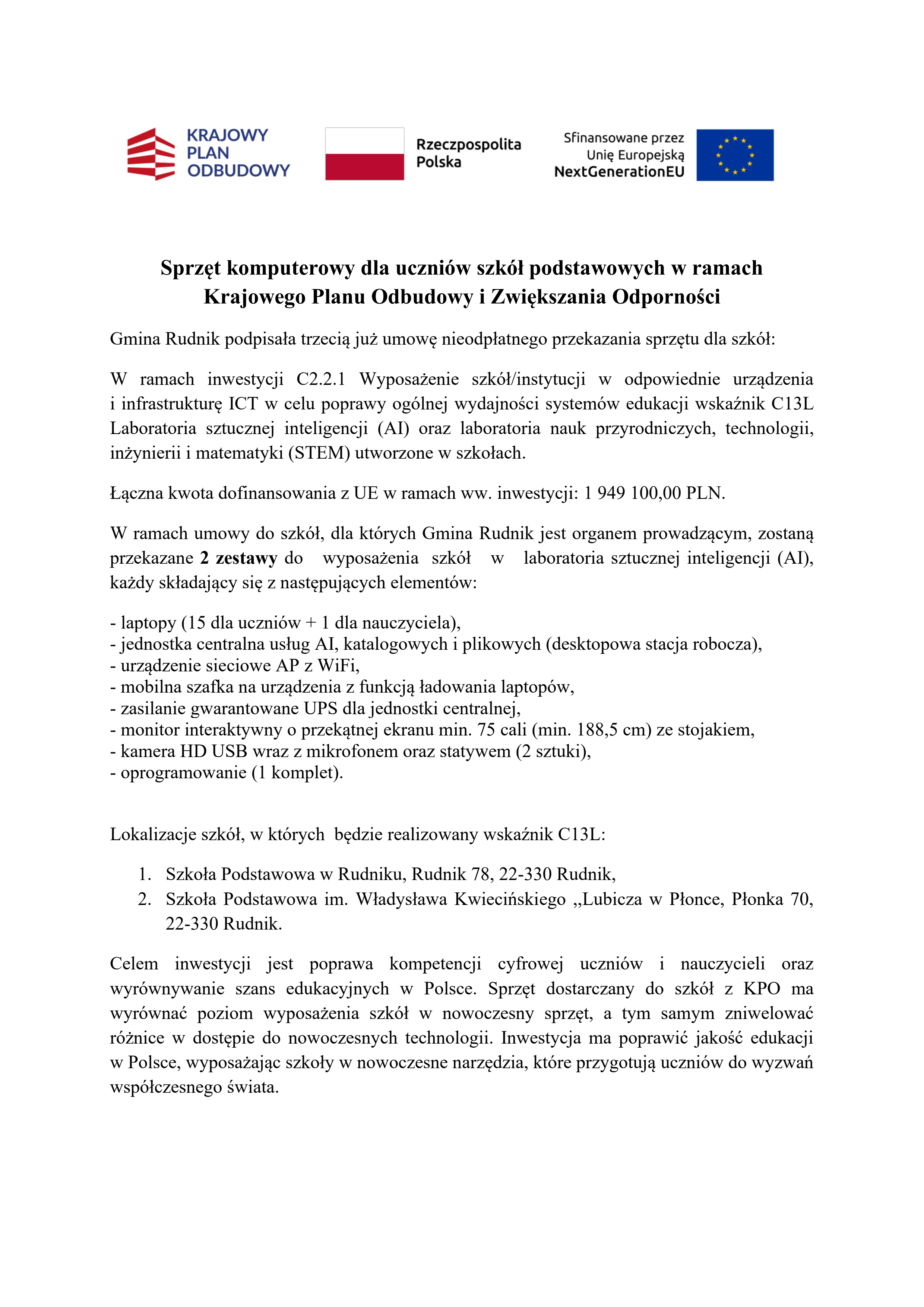 Sprzęt komputerowy dla uczniów szkół podstawowych w ramach Krajowego Planu Odbudowy i Zwiększania Odporności