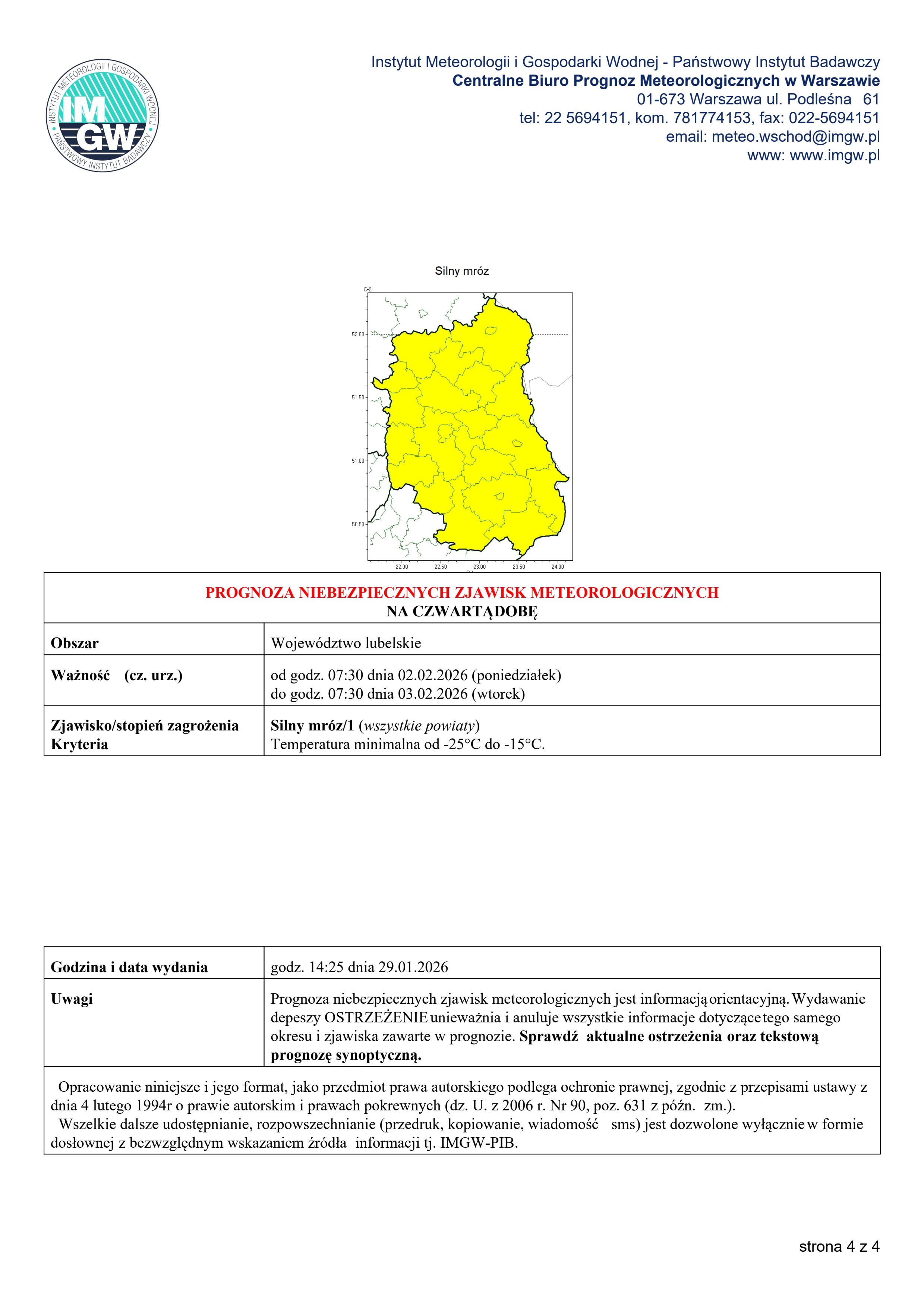 Prognoza niebezpiecznych zjawisk meteorologicznych - silny mróz! 30.01.2026Data publikacji, 30.01.2026, Mariusz KrakowiakAutor, Mariusz Krakowiak, 24Ilość wyświetleń, 24