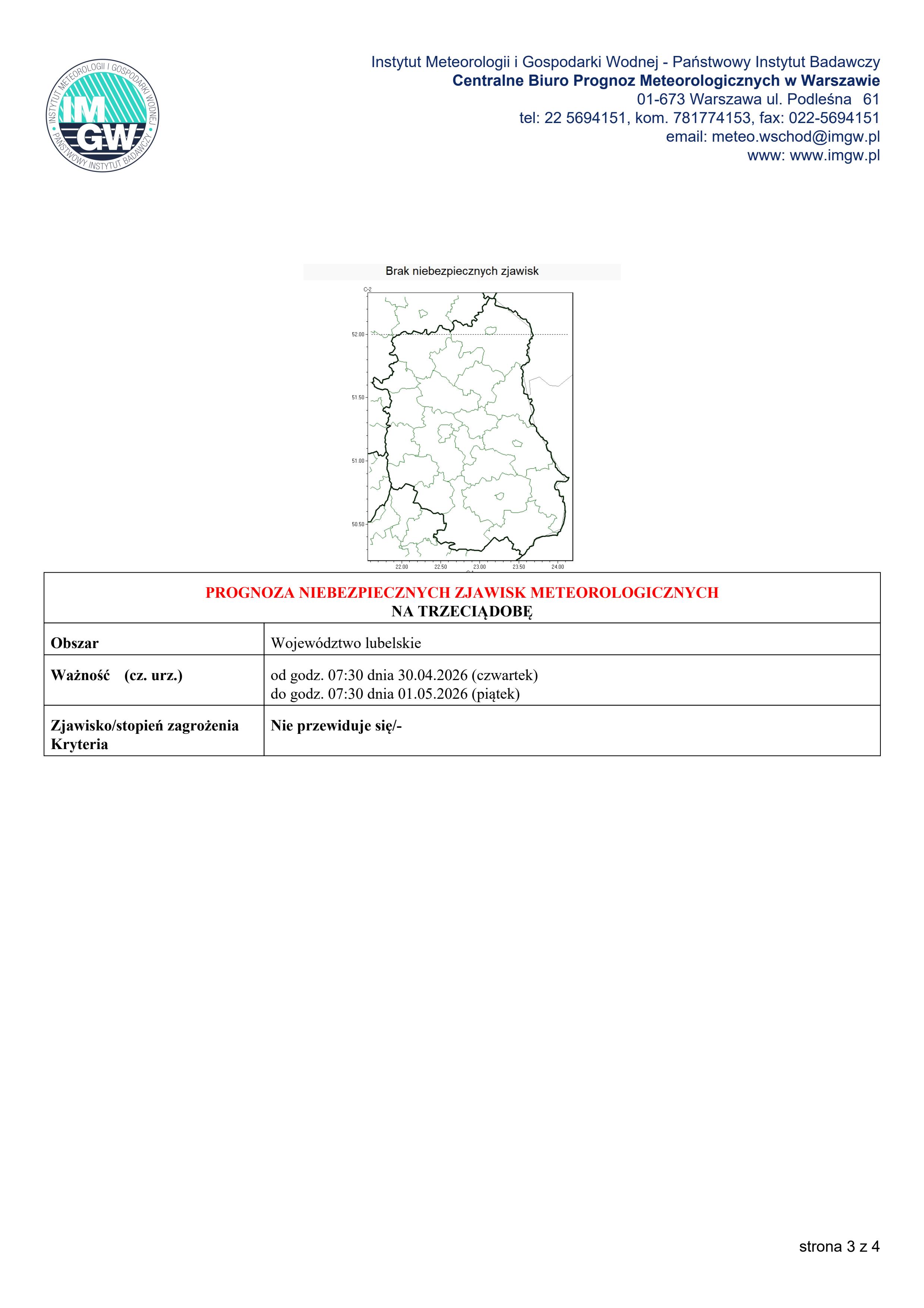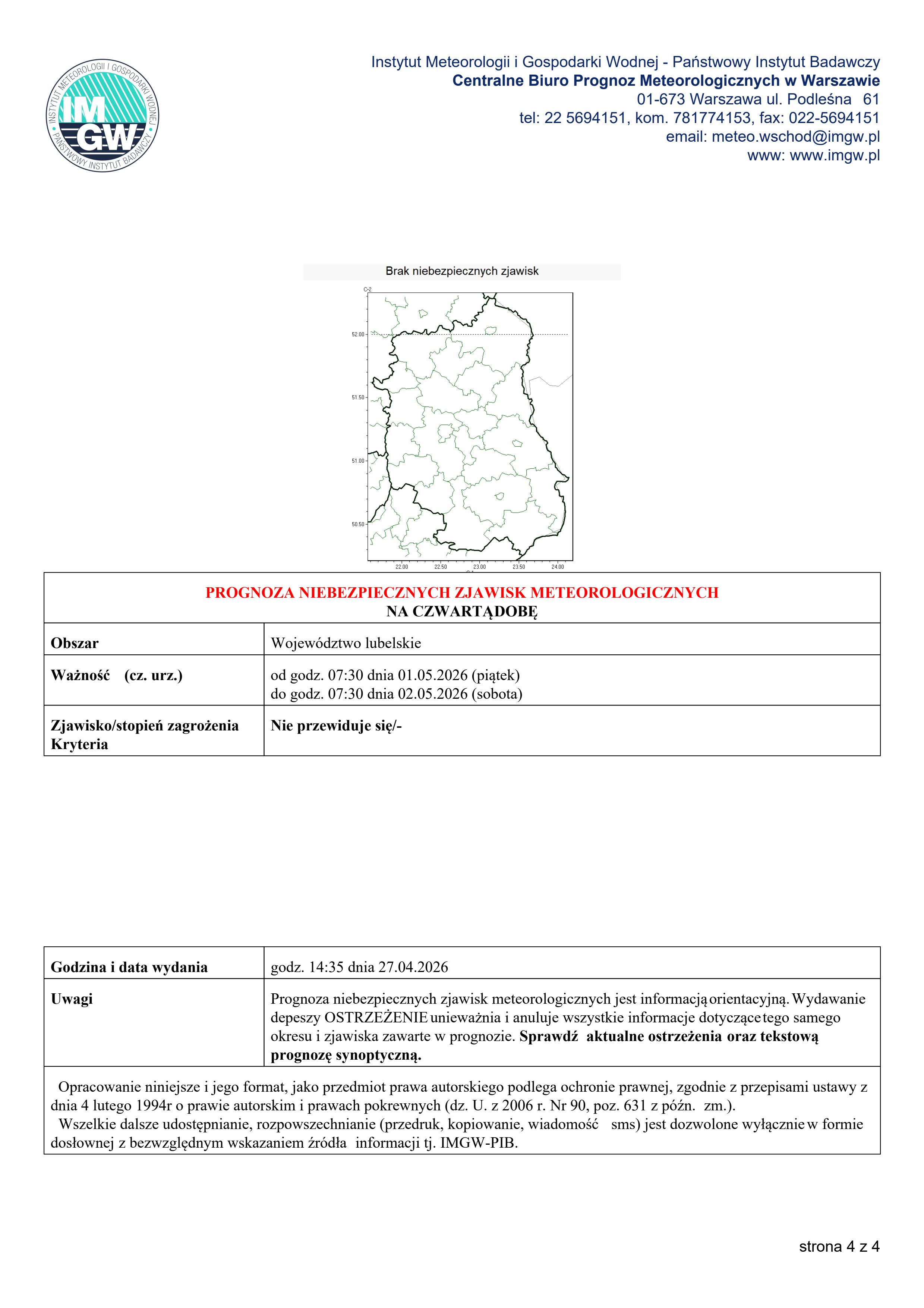 Prognoza niebezpiecznych zjawisk - przymrozki! 27.04.2026Data publikacji, 27.04.2026, Dominika GałkaAutor, Dominika Gałka, 10Ilość wyświetleń, 10