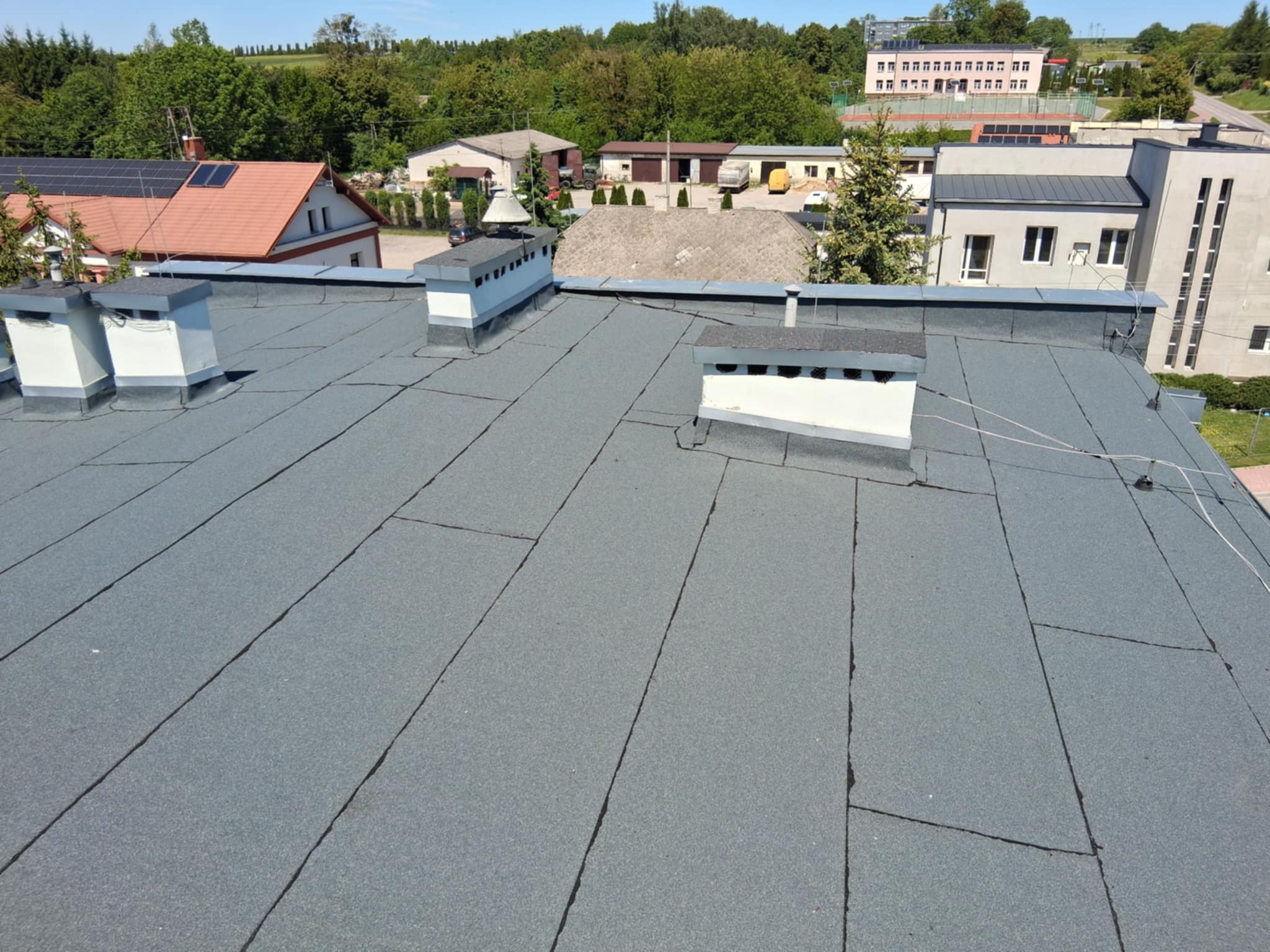 Prace obejmowały obróbki blacharskie, obróbki tynkarskie przewodów kominowych i wentylacyjnych oraz położenie 3 warstw papy termozgrzewalnej.