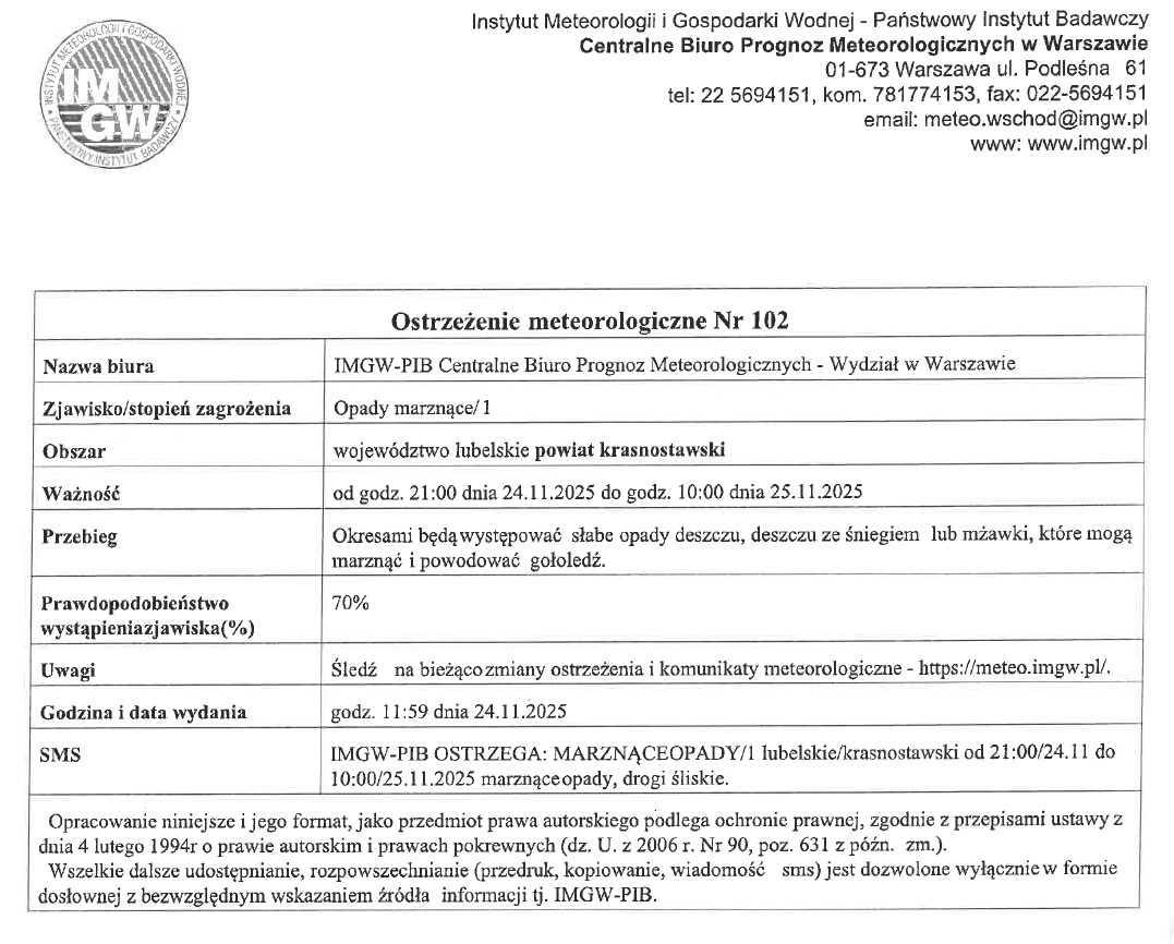 IMGW: Prognoza niebezpiecznych zjawisk - marznące opady! 24.11.2025Data publikacji, 24.11.2025, Mariusz KrakowiakAutor, Mariusz Krakowiak, 11Ilość wyświetleń, 11